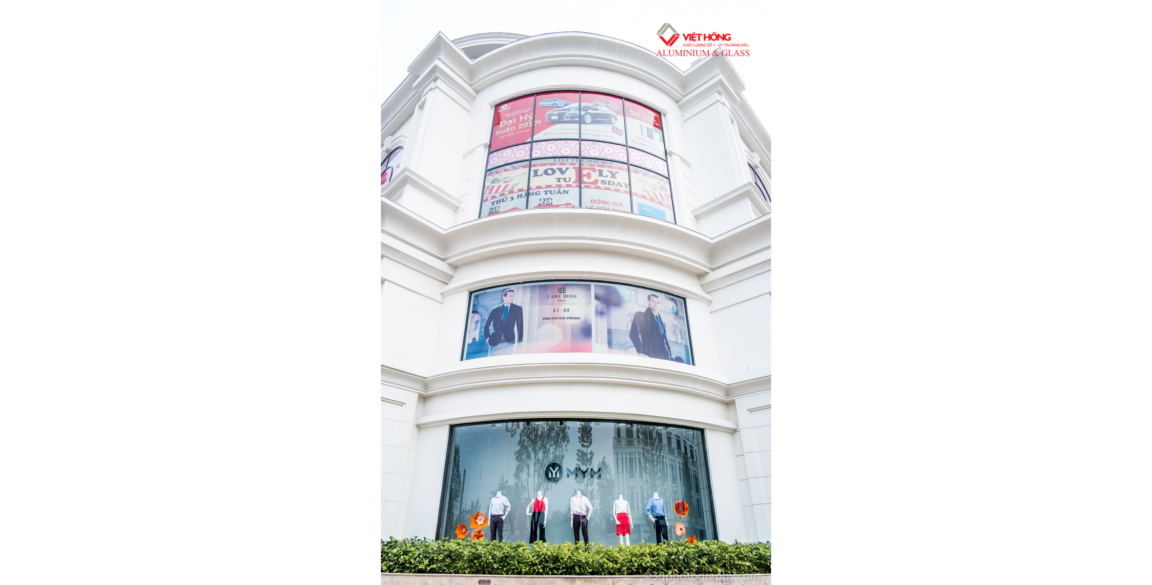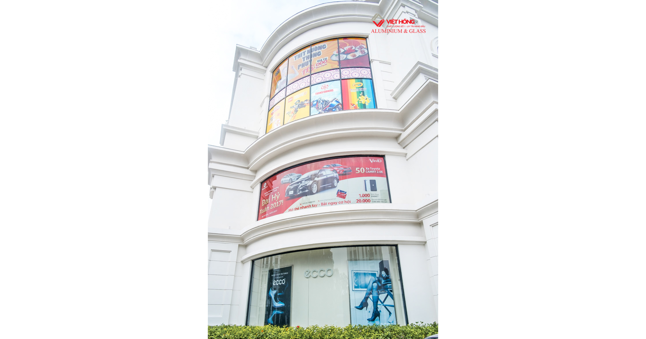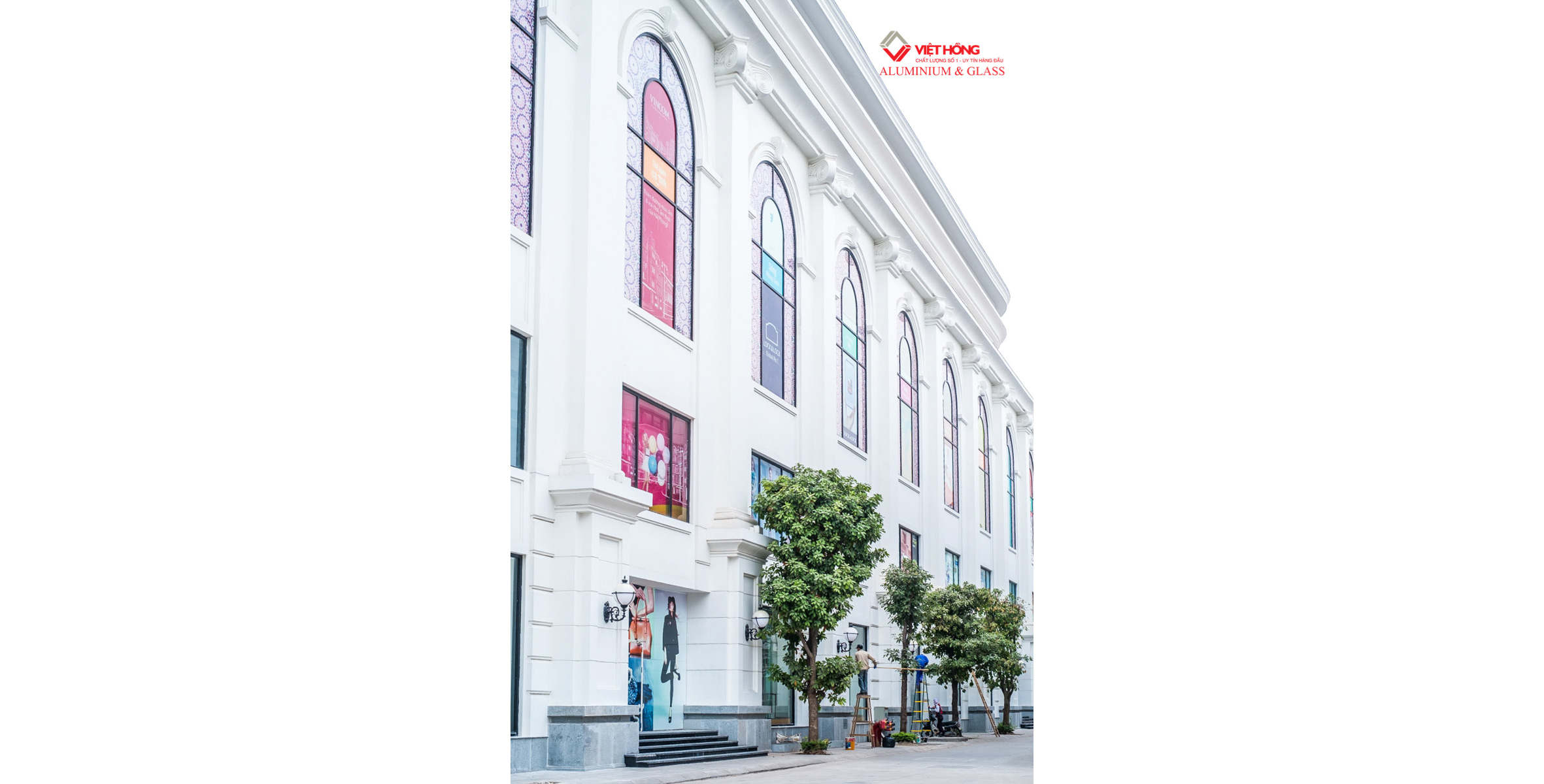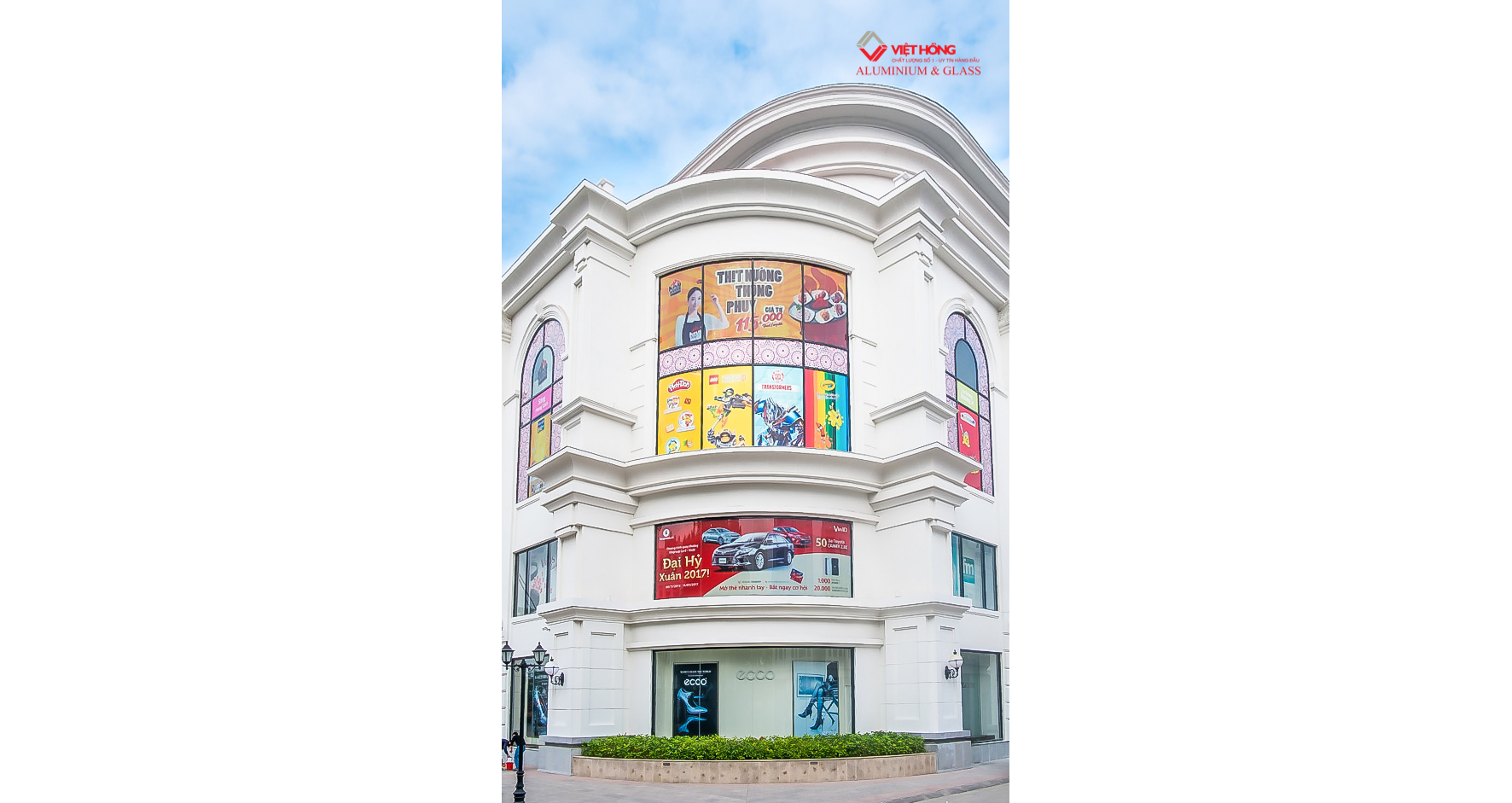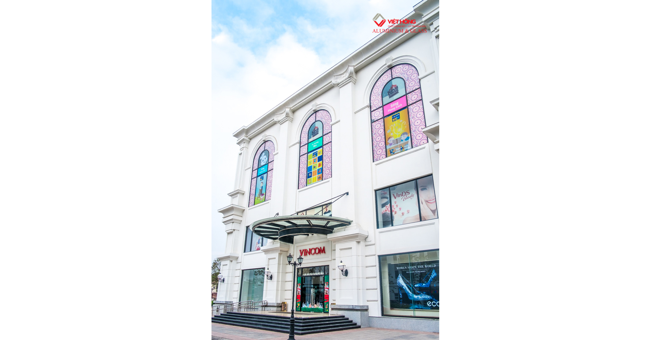 Viet Hong is the contractor for the entire Aluminum & Glass system for Vincom Plaza Hai Phong and 24 surrounding Shophouses. Viet Hong field of work includes: Curtain wall system with Aluminum & Glass arches surrounding the building, Hydraulic glass door for the Shopping center, Glass railing, Rolling door, Swing door, Top hung window