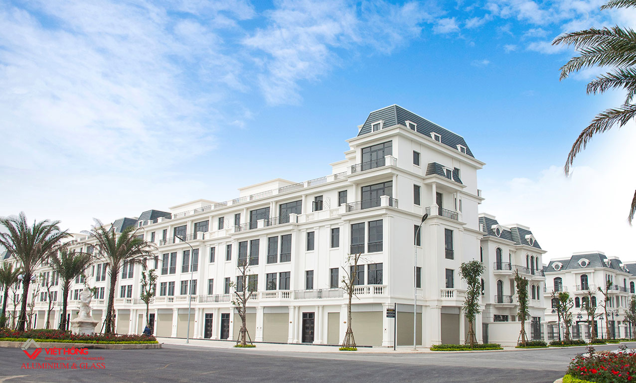 Việt Hồng gia công, lắp đặt hệ thống nhôm kính mặt ngoài cho 63 căn Shophouse/biệt thự. Các hệ sản phẩm nhôm kính sử dụng đa dạng bao gồm: Cửa sổ mở hất, Cửa đi mở quay, Cửa lùa. Toàn bộ hệ thống cửa nhôm, kính, phụ kiện được bảo hành tổng thể 24 tháng.